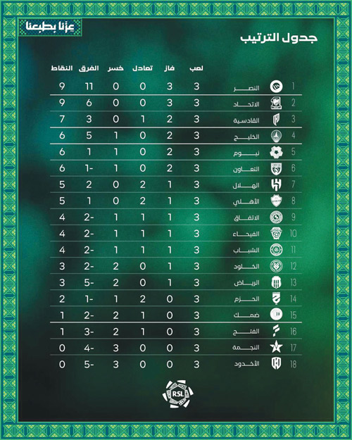حافظ النصر على صدارة دوري روشن السعودي للمحترفين بعد فوزه «السبت» 5-1 أمام 16 ألف متفرج على ملعب الأول بارك لختام الجولة الثالثة، ورفع العالمي رصيده إلى 9 نقاط متقدما على أقرب المطاردين الاتحاد بفارق الأهداف قبل المواجهة المرتقبة بينهما الجمعة على ملعب الإنماء بجدة، في حين بقي رصيد الرياض عند 3 نقاط واحتل المركز الثالث عشر.يدين الأصفر بانتصاره العريض إلى ثنائيتين للبرتغاليين كريستيانو رونالدو ومواطنه جوار فيليكس وبينهما هدف للفرنسي كومان، وجاء الهدف الوحيد للرياض عن طريق مامادو سيلا في الدقيقة 51 وهو أول هدف يستقبله مرمى النصر في هذا الموسم.