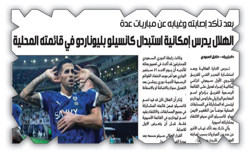 قررت الادارة الهلالية وبعد التشاور مع الجهاز الفني وبناء على التقارير الطبية التي أكدت حاجة المحترف البرتغالي جواو كانسيلو الى برنامج علاجي وتأهيلي سيستمر بضعة أسابيع وسيغيب بسببه عن عدد كبير من المباريات.. قررت مخاطبة لجنة الاحتراف وأوضاع اللاعبين باتحاد الكرة بشأن إجراء تعديل على القائمة الرسمية للفريق الكروي الأول بإدراج اسم المهاجم البرازيلي ماركوس ليوناردو ليتسنى له المشاركة في المسابقات المحلية عوضاً عن كانسيلو الذي سيتم الاكتفاء بمشاركته آسيويا.