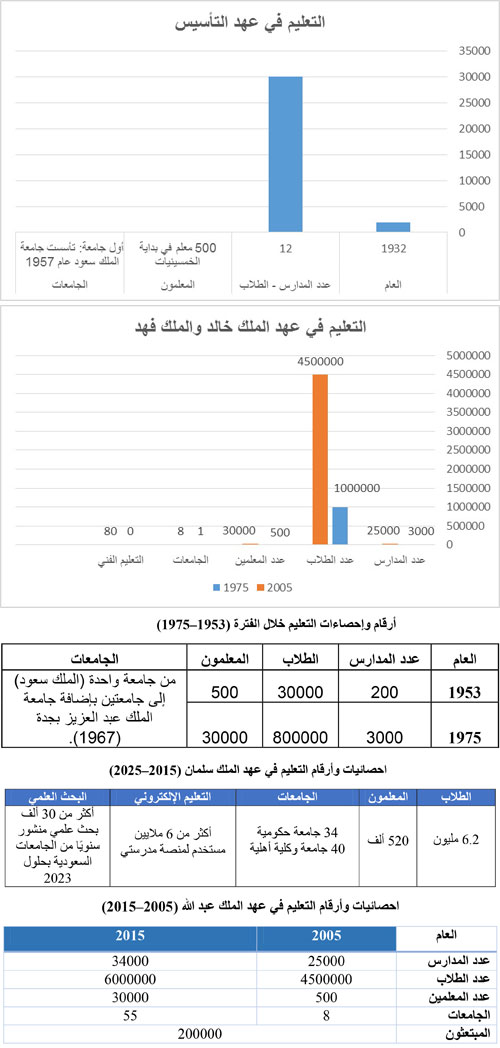 مع مرور العقود، تسارعت الخطوات، من الكتاتيب في ثلاثينيات القرن العشرين إلى آلاف المدارس بحلول التسعينيات، ومن جامعة واحدة عام 1957 إلى أكثر من 70 جامعة وكلية حكومية وأهلية بحلول 2025، ومن مئات الطلاب في عهد التأسيس إلى أكثر من 6 ملايين طالب وطالبة اليوم.