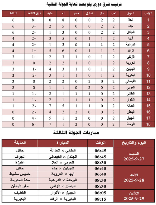 وحسم التعادل السلبي مباراة الفيصلي مع العروبة، ليصل كل منهما لنقطته الثانية في المركزين الحادي عشر والثاني عشر على الترتيب. يذكر أن الجولة الثالثة ستنطلق يوم السبت 27 سبتمبر الجاري وتُقام مبارياتها على مدى 3 أيام، حيث يلتقي الطائي مع العدالة، والجندل مع الفيصلي، والعربي مع العُلا، وأبها مع العروبة، والجبلين مع جدة، والوحدة مع الدرعية، والباطن مع الزلفي، والجبيل مع الأنوار والبكيرية مع الرائد.