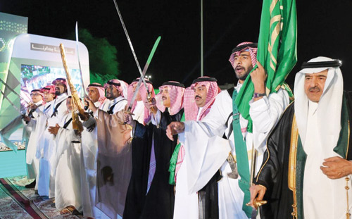 رعى محافظ المجمعة الأستاذ سعود بن عبدالله بن معمر مساء أول أمس احتفال أهالي مدينة المجمعة الذي أقامته بلدية المجمعة في حديقة المقصورة بمناسبة حلول ذكرى اليوم الوطني 95 الذي أقيم هذا العام تحت شعار (عزنا بطبعنا).. وكان في استقبال المحافظ لدى وصوله مقر الحفل رئيس البلدية المهندس محمد بن عوض النفيعي وعدد من المسؤولين، وبعد أن أخذ المحافظ مكانه في الحفل عزف السلام الملكي ثم بدئ الحفل الخطابي الذي حضره عدد من مديري الإدارات الحكومية والأعيان وجمع كبير من المواطنين بالقرآن الكريم، ثم رحب مقدم الحفل الأستاذ عبدالعزيز الفائز بالمحافظ والحضور وتحدث عن توحيد المملكة على يد الملك عبدالعزيز - طيب الله ثراه - وعن الأمن والاستقرار الذي تعيشه بلادنا ودعا الله ان يديم هذه النعمة، بعد ذلك ألقى الشاعر نواف الشلاحي قصيدة وطنية بالمناسبة نالت استحسان الحضور أعقبها أوبريت (دارنا السعودية) الذي قدمته فرقة السلطانة.. ثم كرم المحافظ ورئيس البلدية المؤسسة الراعية للحفل تلاه العرضة السعودية التي شارك فيها محافظ المجمعة الأستاذ سعود بن معمر والأستاذ عبدالله بن محمد الربيعة محافظ القويعية سابقاً ورئيس البلدية المهندس محمد النفيعي وعدد من الحضور.