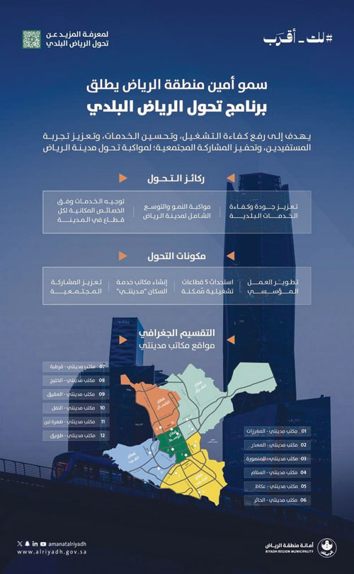 وانطلاقًا من هذا الطموح عملت الأمانة على برنامج تحوّل الرياض البلدي، الذي يتمحور حول تحسين كفاءة تشغيل المدينة ورفع جودة الخدمات المقدمة للمستفيدين ومواءمتها مع احتياجات السكان وخصوصية كل نطاق جغرافي في مدينة الرياض، وذلك من خلال تحويل جميع البلديات الفرعية في مدينة الرياض والبالغ عددها (16) بلدية إلى (5) قطاعات ممكّنة تتولى تقديم خدمات الأمانة المباشرة وغير المباشرة في نطاق معين داخل المدينة، ويتضمن البرنامج استحداث كيانات جديدة تحت مسمى مكاتب «مدينتي» التي تهدف إلى التفاعل مع السكان والقرب منهم وتعزيز تجربتهم مع الأمانة عبر تقديم خدمة العملاء وتنفيذ أنشطة المشاركة المجتمعية.