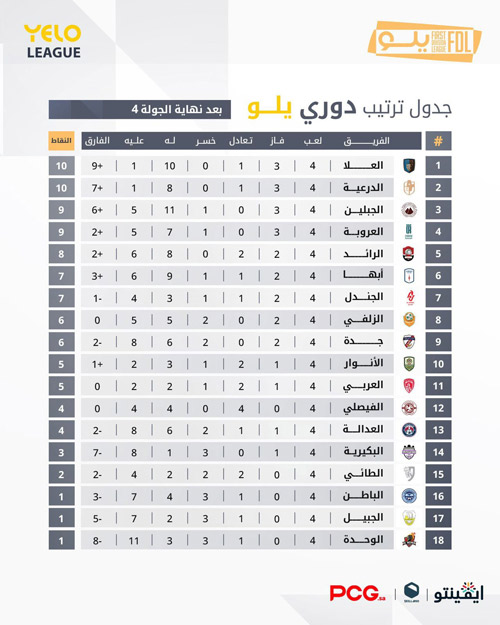 اختتمت منافسات الجولة الرابعة من دوري يلو لأندية الدرجة الأولى للمحترفين التي شهدت 23 هدفًا في 9 مباريات، وواصل العلا والدرعية الصدارة بـ10 نقاط لكل منهما، بينما اشتدت المنافسة خلفهما بين الجبيل والعروبة والرائد.