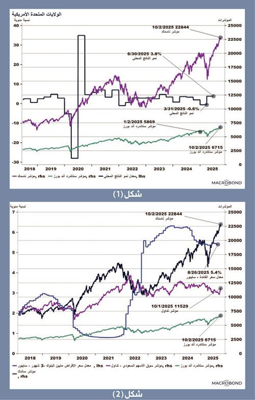 إلا أن هذا التفاؤل المفرط لم يمر دون إثارة مخاوف من احتمالية دخول الأسواق في «مرحلة فقاعية» مشابهة لما حدث في بداية الألفية مع فقاعة الإنترنت أو في الأعوام التي سبقت الأزمة المالية العالمية 2008. ومع أن قوة الأسواق تعكس توقعات المستثمرين بشأن تراجع تكلفة الاقتراض وتحسن هوامش الشركات، إلا أن مؤشرات الاقتصاد الحقيقي في الولايات المتحدة ترسل رسائل مغايرة، ما يضعنا أمام مفارقة تستحق التحليل. ويوضح الشكل (1) الفجوة المتنامية بين معدل نمو الناتج المحلي الأمريكي وأداء مؤشر ناسداك منذ عام 2023، في إشارة إلى أن الأسواق المالية باتت تسعّر المستقبل بدرجة من التفاؤل تتجاوز ما تسمح به الأساسيات الاقتصادية. ويعكس هذا الانفصال المتزايد ميل المستثمرين إلى المراهنة على النمو المستقبلي أكثر من الاستجابة للواقع الاقتصادي الراهن، وهو ما يُنذر باحتمال دخول الأسواق في مرحلة إعادة تقييم أكثر واقعية في المدى المتوسط. وفى حال استمر هذا التباين بين أداء الأسواق والاقتصاد الحقيقي، فقد يشهد عام 2026 مرحلة إعادة توازن بين قيم الأسهم ومؤشرات النمو الفعلي، خصوصًا في حال تباطؤ عوائد قطاع التكنولوجيا أو عودة التضخم للارتفاع. ومع ذلك، تبقى قوة الابتكار والاستثمار في القطاعات الرقمية عاملاً داعمًا لاستدامة النمو على المدى الطويل، شرط أن يتزامن مع سياسات مالية ونقدية أكثر اتزانًا تكبح الإفراط في التسعير وتعيد الارتباط بين الأسواق والاقتصاد الحقيقي.