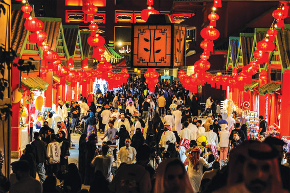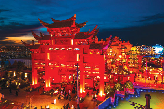 أما منطقة الصين، فهي لوحة من الضوء والرموز، تفيض بالألوان الحمراء التي تُمثّل الحظ والازدهار في الثقافة الصينية، تتوزع المباني بواجهاتها الخشبية وأقواسها المزخرفة، فيما يعتبر مجسم التنين الصيني واحدا من المجسمات البارزة في المنطقة يخطف الأنظار كرمزٍ للقوة والحكمة، وتتداخل رائحة الشاي الصيني العريق مع أنغام الموسيقى الشعبية، وتتحول الممرات إلى سوقٍ يحتفي بالحرف والمنتجات الأصيلة، إنها الصين التي تجلب ماضيها العريق إلى الحاضر، وتقدمه في قالبٍ احتفالي يُشعر الزائر بأنه يسير في قلب بكين القديمة.