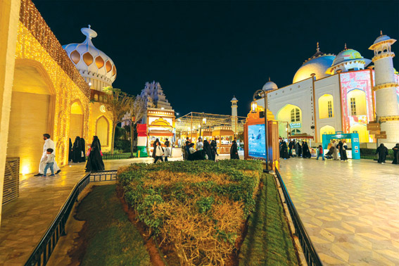 في منطقة الهند، يلتقي الزوار بعالمٍ من الدهشة والعطر والألوان، حيث يفيض المكان بزخارفٍ مستوحاة من قصور (تاج محل)، وترفرف الأقمشة الملوّنة فوق الممرات، وتتعالى أصوات الطبول الهندية المصاحبة للرقصات الشعبية التي تروي حكاياتٍ من الأساطير القديمة، في المتاجر، تتألق أزياء الساري والمجوهرات التقليدية والمنتجات اليدوية، فيما تعبق الأجواء بروائح الكاري والهيل والبهارات التي تحكي قصة بلدٍ يعيش الفرح في كل تفاصيله.