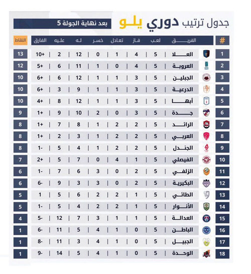 وكسب العُلا ضيفه الدرعية بهدفين لهدف، وبذلك يتصدر جدول الترتيب برصيد 13 نقطة بينما تراجع الدرعية إلى المركز الثالث برصيد 10 نقاط.. وتجاوز جدة مضيفه الباطن بأربعة أهداف مقابل هدف، ليرتفع رصيد جدة إلى 9 نقاط في المركز السادس، بينما بقي الباطن في المركز السادس عشر برصيد نقطة وحيدة.