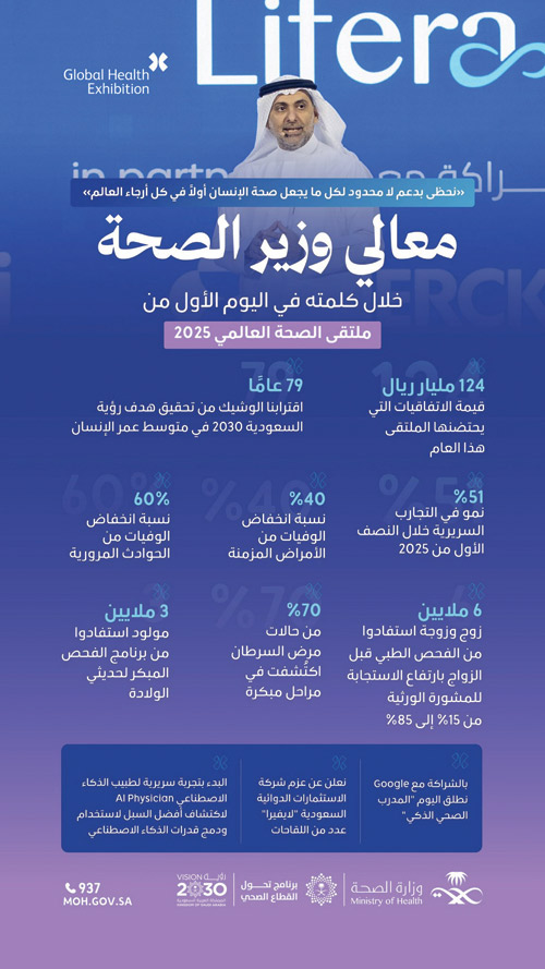 افتتح معالي وزير الصحة الأستاذ فهد بن عبدالرحمن الجلاجل أمس أعمال النسخة الثامنة من ملتقى الصحة العالمي 2025، الذي تستضيفه مدينة الرياض في مركز الرياض للمعارض والمؤتمرات بملهم، تحت شعار «استثمر في الصحة»، وبرعاية وزارة الصحة.ورفع معالي وزير الصحة، الشكر والعرفان للقيادة الرشيدة -حفظها الله- على ما توليه من دعم غير محدود لقطاع الصحة، تحقيقًا لمستهدفات برنامج تحول القطاع الصحي المنبثق من رؤية المملكة 2030، موضحًا أن العالم يواجه تحديات صحية متصاعدة من الأمراض المزمنة وتضخم تكاليف الرعاية إلى نقص الكوادر، مشيرًا إلى أن التحول الصحي في المملكة مكّن من تحقيق قفزات نوعية شملت خفض الوفيات الناتجة عن الأمراض المزمنة بنسبة 40%، وانخفاض وفيات الحوادث المرورية بأكثر من 60%، وارتفاع متوسط العمر المتوقع إلى 79 عامًا، بفضل تكامل الجهود الحكومية، كما استعرض أبرز المبادرات التي تحولت إلى إنجازات واقعية مثل: توطين إنتاج الأنسولين، والتوأم الرقمي، وبرامج الفحص المبكر، والتجارب السريرية، إضافة إلى الجيل الثاني من مراكز تأكد، ونموذج الرعاية الصحية السعودي.