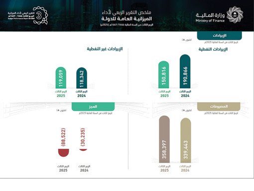 أصدرت وزارة المالية الخميس التقرير الربعي لأداء الميزانية العامة للدولة في الربع الثالث من عام 2025 بإيرادات 269.8 مليار ريال، وبمصروفات 358.4 مليار ريال ، وعجز يُقدر بـ88.5 مليار ريال.