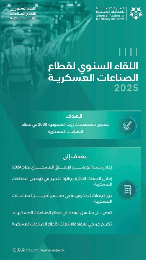وأوضح العوهلي أن نسبة التوطين في الصناعات العسكرية في المملكة وصلت في عام 2024 إلى 24.89 بواقع 25 % من توطين 50 %، ونحن اليوم في هذا اللقاء نحكي قصة النجاح التي تسعى لها بلادنا ونحن نحقق إنجازات عاماً بعد عام والتكامل بين جميع الجهات وبين الجهات العسكرية والأمنية والوزارات والجهات الأخرى في القطاع الخاص والعام ومع المصنعين.
