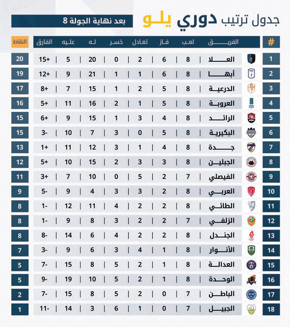 اختُتمت منافسات الجولة الثامنة من دوري يلو لأندية الدرجة الأولى للمحترفين، والتي شهدت إقامة 9 مواجهات على مدار ثلاثة أيام، حملت الإثارة والندية، وسُجل خلالها 20 هدفًا، قبل توقف المنافسات لمدة 12 يومًا بسبب فترة التوقف الدولي للمنتخبات.