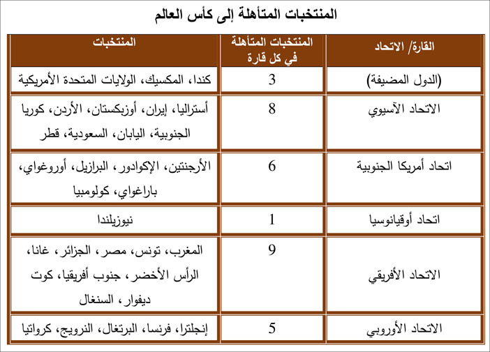 وبذلك يكون عدد المنتخبات المتأهلة لكأس العالم 32 منتخباً من جميع القارات. ويبقى 16 منتخباً في الملحق.