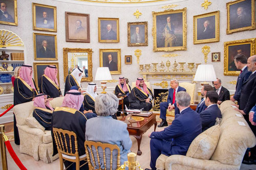 وقال ترامب:»السعودية حليف قوي وشريك مهم»، وأكد أن الأمير محمد بن سلمان رجل رائع ومبهر على كل الأصعدة، ومضى بالقول: «نلتقي اليوم بصديق رائع وأكن احتراما كبيرا للملك سلمان، وعقدت اجتماعا رائعا مع الأمير محمد بن سلمان»، وقال ترامب لولي العهد السعودي: «أريد أن أشكرك لأنك قبلت باستثمار 600 مليار دولار في أمريكا».