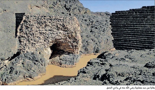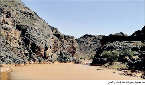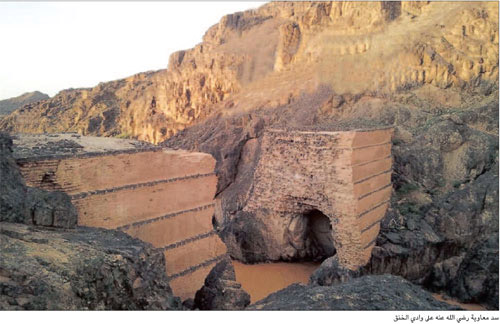 تحتضن المدينة المنورة عدداً من الأودية التاريخية الشهيرة مثل: وادي العقيق، ووادي بطحان ووادي مهزور وغيرها، ومن تلك الأودية وادي الخنق الذي يقع شرق المدينة المنورة في حرة واقم، ويبدأ من قاع حضوضاء وعندما يمتلئ بالماء الذي يسيل إليه من جبال حضوضاء والجبال الأخرى المحيطة به، يتجه نحو الشمال الغربي، ثم يقطع الطريق السريع بين المدينة والقصيم، وبعد ذلك يفرغ ماءه في قاع العاقول جنوب مطار المدينة المنورة، ثم تخرج مياه هذا القاع باسم وادي العاقول وتتجه غرباً لتمر بمقبرة شهداء أحد رضي الله عنهم، حيث يسمّى وادي قناة الذي يصب في وادي العقيق الشهير (مجمع الأسيال) لتشكل جميع أودية المدينة وادياً واحداً يطلق عليه وادي إضم تاريخياً (وادي الحمض حالياً) الذي يصبّ في البحر الأحمر بين الوجه وأملج، ويعتبر وادي الخنق من أهم أودية شرق المدينة المنورة، ومنطقة الخنق التي أطلق عليها اسم الوادي عبارة عن نقطتين ضيقتين وكلتا النقطتين أقيم عليهما سد في زمن معاوية رضي الله عنه عندما كان أميراً للمؤمنين بموجب النقش التأسيسي المثبت فوق قمته في الجهة الجنوبية الغربية، وتتكون من عشرة أسطر نفذت بالخط الكوفي البسيط غير المنقوط وذلك بصيغة: «بسم الله الرحمن الرحيم/ هذا السد لعبد الله/ معاوية أمير المؤمنين/ اللهم بارك له فيه رب/ السموات والأرض/ بناه أبو رداد مولى/ عبد الله بن عباس بحول الله وقوته/ وقام عليه كثير بن/ الصلت وأبو موسى. وأقيم عليهما السد لحجز المياه بحيث يكوّنان بحيرة خلفية بطول 1600 متراً وعرض 350 متراً، أي: بسعة إلى حوالي 560.000 متراً مكعباً من المياه، وتوجد على امتداد وادي الخنق كثرة المناطق المنخفضة والتي يطلق عليها: قيعان وشعاب تتجمع فيها مياه السيول والأمطار، وهذه المنطقة تربتها صالحةٌ للزراعة، لذا فقد استغل المسلمون في العصور الإسلامية المبكرة هذه المناطق للزراعة وأقاموا عليها السدود وحفروا الآبار لريّ هذه الزراعة، وهذان السدّان نموذجان للتقدم المعماري والهندسي للمسلمين في العصور الإسلامية المبكرة، فالسد الأول يقع في أضيق نقطة على وادي الخنق، ويتعجب المرء للبراعة المساحية (الجيولوجية) لمن اختار هذا المكان، فإن هذا المكان هو أضيق نقطة على طول هذا الوادي كله، ولعلّ اسم الوادي (الخنق) اكتسب من هذا الممرّ الضيق ذي الجوانب العالية، ولم يبق هذا السد إلا كتلتان كبيرتان على الجانبين، أما الجء الأوسط فقد انهار تماماً، وما تبقى من السدّ رغم مرور أكثر من 1400 سنة تقريباً على إنشائه لهو دليلٌ على قوة بناء هذا السد وشدة صلابته ومقاومته للكسر، وقد بني السد بشكل متدرج بحيث تكون قاعدته أعرض من قمته، حيث يصل عرض السد عند القاعدة 17.5 متراً ويصل عرض جدار السد العلوي حوالي 12.70 متراً ويبلغ طول السد حوالي 56 متراً وقد استخدمت في بناء السد الحجارة النارية (بازلتية) الممزوجة بالمونة المكونة من النورة المصهورة، وإلى الغرب من السد الأول يقع السد الثاني، حيث بني في نقطة ضيقة أخرى تنصرف إليها سيول الوادي عند امتلاء بحيرة السد الأول منعاً لتسرب المياه،ويتضح من رؤية السدين وأسلوب بنائهما من حيث السماكة والارتفاع أنهما كانا يحجزان أكبر كمية من مياه وادي الخنق ويمكث تلك المياه لمدة طويلة بحيث يستفيدون في ري الزراعة، وعلى كلّ حال فما تبقى من السد يعطي عن أسلوبه المعماري والهندسي، كما أن بناء السد في أضيق موقع لهو دليلٌ على تقدم المسلمين في ذلك الزمن.