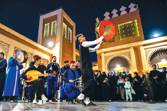 وتشمل هذه العروض استعراضات فلكلورية، وعروضا ترحيبية متجولة، ورقصات شعبية، وعروضا موسيقية حية، تُقدَّم وفق جدول زمني متنوع يضمن استمرارية المشهد الترفيهي من الافتتاح وحتى ساعات الإغلاق.