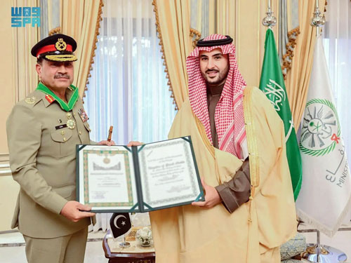 إنفاذًا لأمر خادم الحرمين الشريفين الملك سلمان بن عبدالعزيز آل سعود -حفظه الله-، قلَّد صاحب السمو الملكي الأمير خالد بن سلمان بن عبدالعزيز وزير الدفاع، معالي قائد الجيش الباكستاني المُشير عاصم منير، وسام الملك عبدالعزيز من الدرجة الممتازة؛ تقديرًا لجهوده المميزة في توطيد وتعزيز أواصر الصداقة والتعاون المشترك، وتطوير العلاقات السعودية الباكستانية. جاء ذلك خلال استقبال سموه لمعاليه، في مكتبه بالرياض أمس، وهنأ سمو الأمير خالد بن سلمان، المُشير عاصم منير بمناسبة تعيينه قائدًا لقوات الدفاع بجمهورية باكستان الإسلامية، متمنيًا له التوفيق والسداد.