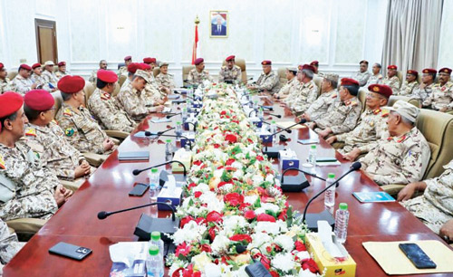 في سياق آخر، ولأول مرة، ترأس نائب رئيس هيئة الأركان العامة، اللواء الركن أحمد البصر، أمس، اجتماعاً موسعاً بديوان عام وزارة الدفاع، في العاصمة المؤقتة عدن، تطرق خلاله لمستجدات الأوضاع السياسية والعسكرية التي تشهدها البلاد، وفي أول سابقة من نوعها يحضر قادة الجيش بلباسهم الوطني وإلى جوارهم العلم الوطني منذ 10 سنوات، فرض فيها المجلس الانتقالي الأعلام التشطيرية وزيا عسكريا من خارج المؤسسة العسكرية.