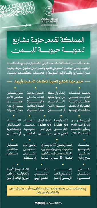 معتبراً هذا الدعم السخي تجسيداً لتوجيهات خادم الحرمين الشريفين الملك سلمان بن عبدالعزيز، وسمو ولي عهده صاحب السمو الملكي الأمير محمد بن سلمان بن عبدالعزيز اللذين وضعا اليمن وشعبه في صدارة اهتمامات المملكة، إيماناً بأن استقرار اليمن ركيزة لأمن المنطقة، وبأن دعم الدولة اليمنية ومؤسساتها واجب أخوي ومسؤولية عربية وإنسانية.