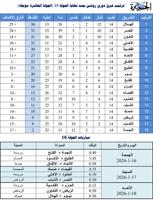 بعد جولة غاية في الإثارة والندية احتدمت فيها المنافسة على وصافة الترتيب بين أربعة أندية للحاق بالمتصدر الهلال الذي وسَّع الفارق مع منافسيه، تنطلق اليوم الجمعة مواجهات الجولة السادسة عشرة من دوري روشن للمحترفين بـ3 مباريات على أن تتواصل مبارياتها يوم السبت كذلك بـ3 مباريات، في الوقت الذي تختتم الجولة يوم الأحد كذلك بـ3 مباريات.