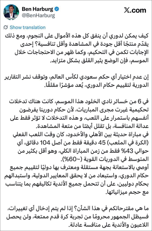 وجه رئيس نادي الخلود (بن هاربوج) نقداً لاذعاً للتحكيم المحلي وأنه - أي الصافرة المحلية - تسببت بتقديم منتج أقل جودة في المشاهدة وأقل تنافسية. وذكر أن عدم اختيار حكام سعوديين لكأس العالم وتوقف نشر التقارير الدورية لتقييم الحكام يعد مؤشراً مقلقاً.