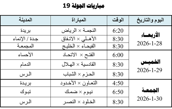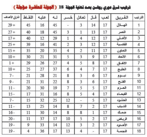 في ختام الجولة 18 من الدوري جرت أمس ثلاث مباريات ففي الرس حقق الحزم انتصاراً مستحقاً على ضمك بهدفين لهدف وفي الرياض نجح النصر بتجاوز التعاون بهدف سجله مدافع التعاون الدوسري في مرماه وكان يمكن أن تكون المباراة أجمل لو لم يقتلها حكمها ماجد الشمراني بكثرة صافراته بسبب وبدون وتجاهله إنذار عدد من اللاعبين لتجاوزاتهم وفي جدة فاز الاتحاد على الأخدود 2-1.