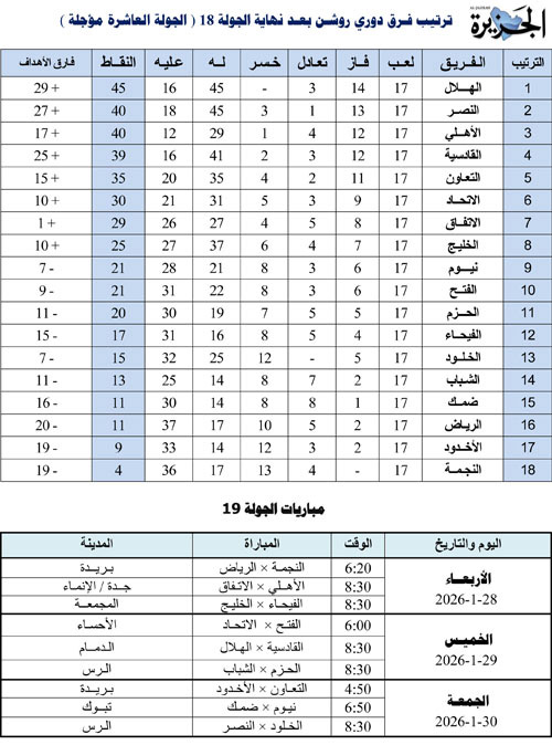 تنطلق مساء اليوم الأربعاء مواجهات الجولة التاسعة عشرة من دوري روشن للمحترفين بعدما انقضت جولة في غاية الأهمية والإثارة راح ضحيتها المتصدر الهلال بتعادل قرَب المنافسين منه وصاحب المركز الرابع التعاون بخسارة قلصت آماله في اللحاق بالمنافسة، فيما استفادت أندية القادسية والنصر والأهلي بالاقتراب من المتصدر وكذلك الاتحاد الذي عدل وضعه، واستفاد كذلك كل من الفيحاء والحزم من صدامات الجولة الماضية لندخل هذه الجولة بأكثر شراسة وندية ستكون مفصلية بدرجة كبيرة ربما تتغير معها معالم الدوري، وستكون المباريات على النحو التالي: