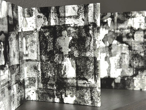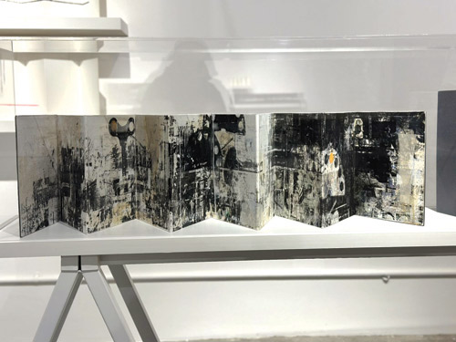 الأعمال المعروضة لا تقدّم سرداً خطياً ولا تحاول إرشاد العين إلى بداية أو نهاية واضحة، الدفاتر المطوية الممتدة على الطاولات تفرض إيقاعاً بصرياً أقرب إلى المشي داخل مشهد متحوّل، الطيّات المتكررة تصنع مسارات والصفحات السميكة تتحوّل إلى جدران صغيرة والفراغات بين الطيات تصبح لحظات صمت لا تقل أهمية عن العلامة البصرية نفسها، اللون في أغلب الأعمال يتراجع لصالح الأسود والرمادي والبياض وكأن الصورة تنبع من الذاكرة أكثر مما تنبع من المشاهدة المباشرة.
