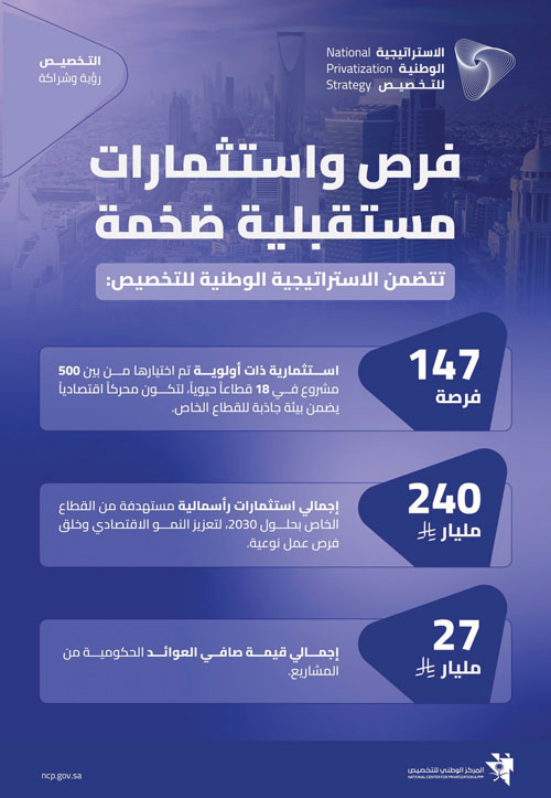 وتهدف الإستراتيجية الوطنية للتخصيص إلى رفع مستوى الرضا تجاه الخدمات المقدمة للمواطنين والمقيمين والزائرين في 18 قطاعًا مستهدفًا باستحداث عشرات الآلاف من الوظائف النوعية، وأن يبلغ إجمالي العقود الموقعة الناتجة عن الشراكة بين القطاعين العام والخاص أكثر من 220 عقدًا حتى عام 2030م، وأن تزيد قيمة الاستثمارات الرأسمالية من القطاع الخاص على 240 مليار ريال حتى عام 2030م.