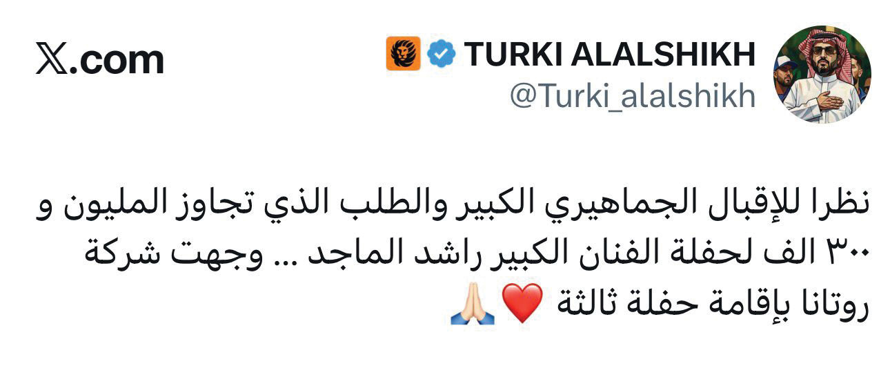 وفي سياق متصل كشف معالي المستشار تركي آل الشيخ على حسابه الرسمي على منصة X عن ليلة غنائية ثالثة كاتبا «نظرا للإقبال الجماهيري الكبير والطلب الذي تجاوز المليون و 300 ألف لحفلة الفنان الكبير راشد الماجد، وجهت شركة روتانا بإقامة حفلة ثالثة».