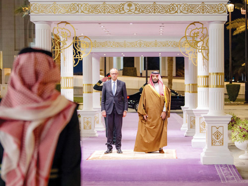 وفي بداية الجلسة رحب سمو ولي العهد بدولة المستشار الاتحادي لجمهورية ألمانيا الاتحادية في المملكة، فيما عبر دولته عن سعادته بهذه الزيارة ولقائه سمو ولي العهد.