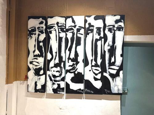 في هذا الفضاء الفني، تغدو الوجوه خرائط شعورية؛ فلا تُرسم الملامح بحدود صارمة، بل تتشكل من خلال شبكة من الخطوط البيضاء أو السوداء التي تدور وتلتف لتخلق العيون والأنف والفم، مانحة الشخوص طاقة حركية وكأنها في حالة قلق أو تساؤل دائم. وتلعب الألوان دور البطولة في هذا السرد البصري، فنجد وجوهاً غارقة في درجات الأزرق العميق، تأخذ المتلقي إلى عوالم من السكينة أو ربما العزلة الشجنية، بينما تشتعل لوحات أخرى بالأحمر الصريح لتعبر عن توهج العاطفة والحياة. وفي زاوية أخرى، تتجرد بعض الأعمال من اللون لتكتفي بصراع الأبيض والأسود، مقدمة وجوهاً تطاولت ملامحها لتبدو كأقنعة درامية تكتم أسراراً دفينة.