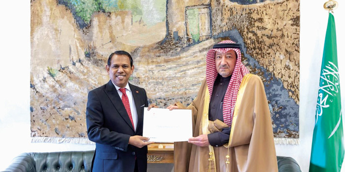 تلقى صاحب السمو الملكي الأمير محمد بن سلمان بن عبدالعزيز آل سعود ولي العهد رئيس مجلس الوزراء -حفظه الله-، رسالة خطية، من فخامة الرئيس الدكتور محمد معز رئيس جمهورية المالديف، تتصل بالعلاقات الثنائية بين البلدين. تسلم الرسالة معالي نائب وزير الخارجية المهندس وليد بن عبدالكريم الخريجي، خلال استقباله في مقر الوزارة بالرياض الخميس سفير جمهورية المالديف لدى المملكة أحمد سرير.وجرى خلال الاستقبال استعراض العلاقات الثنائية، ومناقشة الموضوعات ذات الاهتمام المشترك.