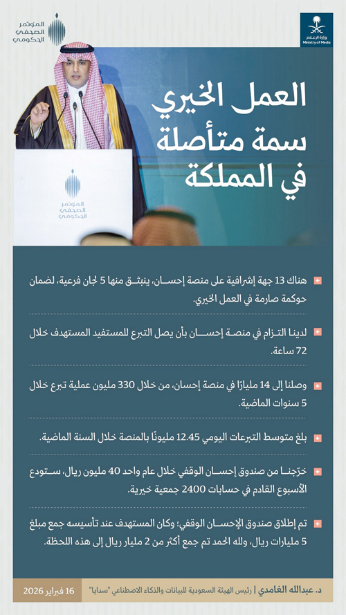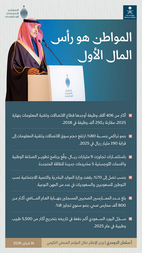 وقال وزير الإعلام خلال المؤتمر الصحفي الحكومي الذي عقد أمس: «في كل عام تتطور السياقات وتتجدد الأسئلة لكن الإجابة في المملكة واحدة، العمل لا يتوقف بين التخطيط والتنفيذ والمراجعة تمضى الدولة منجزاتها بثبات ضمن مسار يقدم الأثر ويؤمن بالاستدامة ويعمل بثقة الإنجاز».