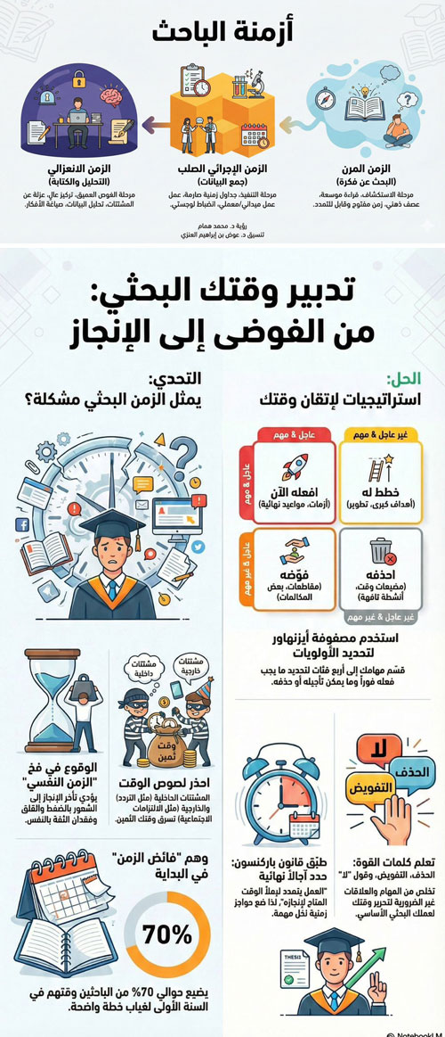 تنبع أزمة الزمن البحثي من اختلال في ثلاثة مستويات: فردي (في عقلية الباحث)، منهجي (في أولويات المهام)، ومؤسساتي (في بيئة البحث).