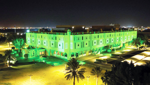 تزين مبنى إمارة منطقة تبوك بشعار التأسيس واللون الأخضر احتفاءً بيوم التأسيس الموافق اليوم الأحد 22 فبراير 2026.
