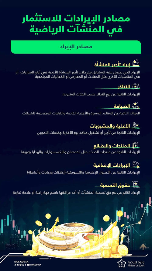 ويتيح هذا المشروع فرصًا متنوعة لتحقيق الإيرادات من التذاكر المباعة، ومنافذ الأغذية والمشروبات، والضيافة، والإعلانات، وحقوق التسمية للمنشآت (باستثناء ملعب الإنماء)، إضافة إلى استضافة الفعاليات غير الرياضية والأنشطة المجتمعية المختلفة، ما يعكس التزام الوزارة بتمكين المستثمرين محليًا ودوليًا، ورفع الكفاءة التشغيلية والمالية للمنشآت الرياضية، مع تطوير فرص جديدة في الرعاية والإعلانات والضيافة، بما يواكب مستهدفات تطوير القطاع الرياضي في المملكة.