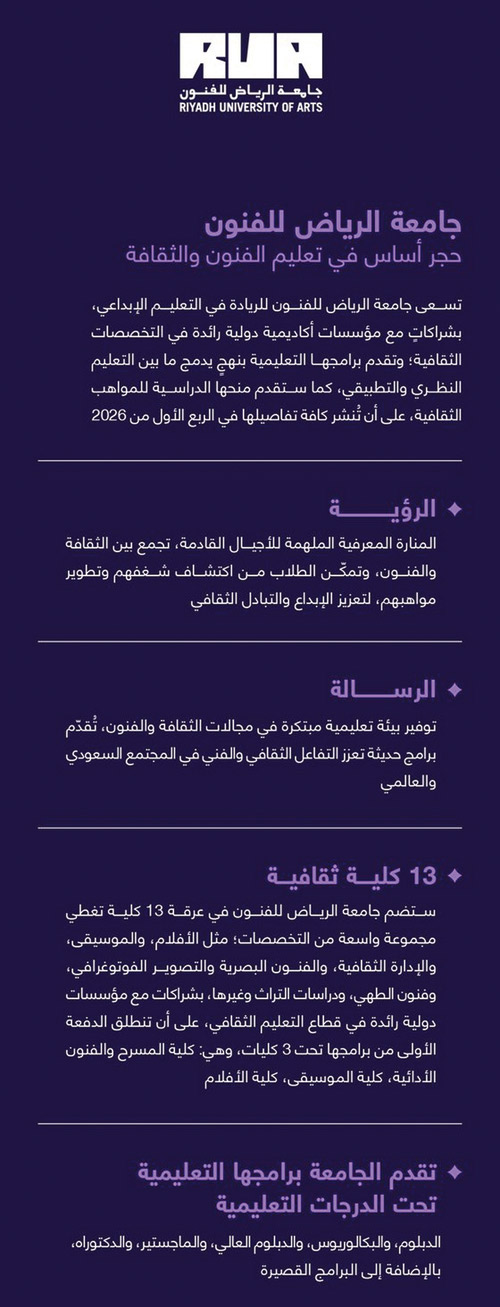 ويأتي تأسيس جامعة الرياض للفنون امتدادًا لما توليه القيادة الرشيدة -أيدها الله- من عنايةٍ واهتمامٍ بتطوير القطاع الثقافي، وتعزيز منظومة التعليم المتخصص في مجالات الثقافة والفنون، بما يسهم في إعداد الكفاءات الوطنية في التخصصات الإبداعية المختلفة، وتوفير بيئة تعليمية متقدمة تسهم في دعم الحِراك الثقافي وتنمية الصناعات الثقافية والإبداعية في المملكة.