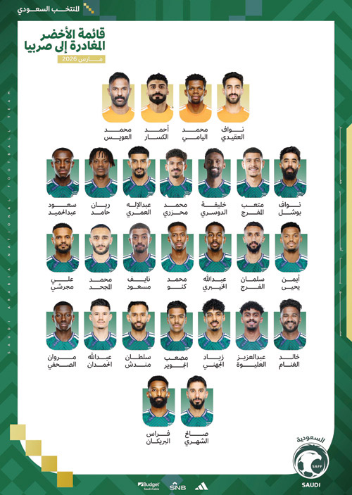 وأصبحت قائمة المنتخب في معسكر صربيا مكونة من 27 لاعبا هم: محمد العويس نواف والعقيدي ومحمد الربيعي وأحمد الكسار، ونواف بوشل ومتعب المفرج وخليفة الدوسري ومحمد محزري وعبدالإله العمري وريان حامد وسعود عبدالحميد وعلي مجرشي وأيمن يحيى وسلمان الفرج وعبدالله الخيبري ومحمد كنو ونايف مسعود ومحمد المجحد وخالد الغنام وعبدالعزيز العليوة وزياد الجهني ومصعب الجوير وسلطان مندش وعبدالله الحمدان ومروان الصحفي وصالح الشهري وفراس البريكان.