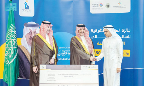 من جهة ثانية رعى سمو أمير المنطقة الشرقية رئيس لجنة السلامة المرورية بالمنطقة، ورئيس مجلس أمناء جائزة المنطقة الشرقية للسائق المثالي بديوان الإمارة أمس ، الحفل الختامي لتكريم الفائزين بالجائزة في فروعها المختلفة في نسختها الثامنة، التي تأتي امتدادًا لجهود تعزيز السلامة المرورية وتحفيز مستخدمي المركبات على الالتزام بأنظمة المرور.