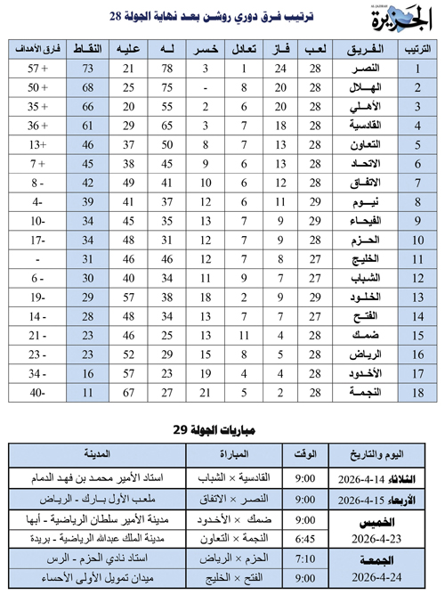 ضمن مباريات الجولة الـ28 من الدوري جرت أمس أربع مباريات، ففي ملعب التعاون نجح الخلود بتحقيق فوز ثمين على التعاون بهدفين مقابل هدف، وفي لقاء النجمة ونيوم حقق الأخضر انتصارا ب1/2 وفي ملعبه بالرس واصل الحزم تقديم مستوياته الرائعة وهزم الفيحاء بهدفين دون رد، وفي نجران عزز النصر صدارته للدوري بهدفي نجميه رونالدو وفيلكس دون رد للأخدود.