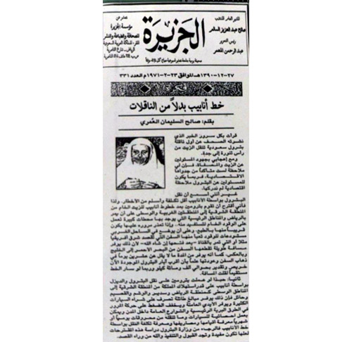 ما يجدر ذكره أن فكرة مد خط أنابيب البترول كان قد طرحها مبكراً بحسٍّ استباقي في قراءة المستقبل أحد روّاد التربية والتعليم والصحافة والإعلام البارزين في تاريخ الإعلام السعودي: الشيخ: (صالح السليمان العُمَري) الوجيه صاحب الصيت والحضور في مختلف المجالات لا على مستوى بريدة والقصيم فحسب بل على مستوى الوطن السعودي والذي تُوفي -رحمه الله وأسكنه فسيح جناته- عام 1411هـ في مقالٍ له بجريدة الجزيرة بتاريخ 27 ذي الحجة 1390هـ الموافق 23 فبراير 1971م أي قبل الشروع بالتنفيذ بأكثر من عشر سنوات، وفي العرف الإعلامي والصحفي وتحديداً في جانب الكتابة يقولون: «الكاتب الحقيقي بالشأن العام خاصّة؛ هو من يصنع الحدث لا من ينتظر فقط وقوعه ليعلّق عليه»!