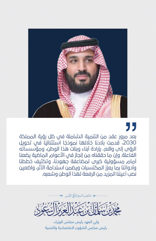 فيما أكد صاحب السمو الملكي الأمير محمد بن سلمان بن عبدالعزيز ولي العهد رئيس مجلس الوزراء -حفظه الله- أن ما تحقق من إنجاز في الأعوام الماضية يضعنا أمام مسؤولية كبرى لمضاعفة جهودنا، وقال: «بعد مرور عقد من التنمية الشاملة في ظل رؤية المملكة 2030، قدمت بلادنا خلالها نموذجاً استثنائياً في تحويل الرؤى إلى واقع، بإرادة أبناء وبنات هذا الوطن، ومؤسساته الفاعلة، وإن ما حققناه من إنجاز في الأعوام الماضية يضعنا أمام مسؤولية كبرى لمضاعفة جهودنا، وتكثيف خططنا وأدواتنا بما يعزز المكتسبات ويضمن استدامة الأثر، واضعين نصب أعيننا المزيد من الرفعة لهذا الوطن وشعبه».