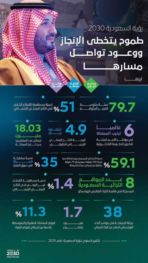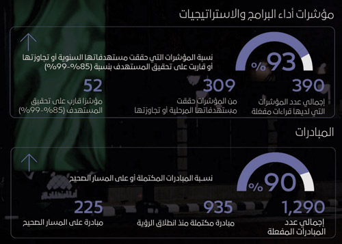 وأظهر التقرير السنوي للرؤية لعام 2025 أن 93 في المائة من مؤشرات الرؤية حققت مستهدفاتها السنوية أو تجاوزتها، فيما بلغت 309 مؤشرات من أصل 390 من مستهدفاتها المرحلية أو فاقتها، إضافة إلى اكتمال 935 مبادرة من أصل 1290، فيما تسير 225 مبادرة وفق المسار الصحيح.