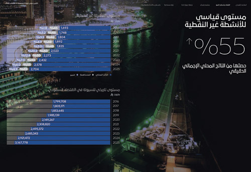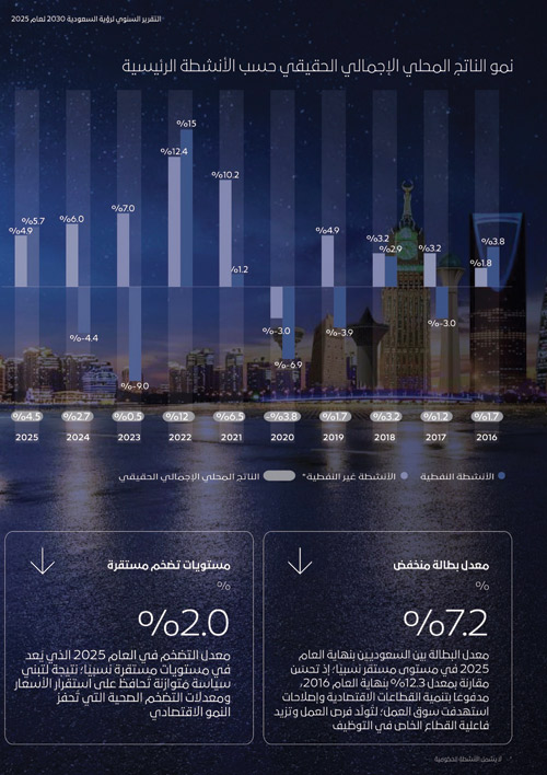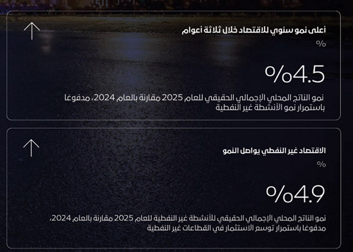 حقق الاقتصاد السعودي نمواً بنسبة 4.5 في المائة في 2025، مسجلاً الأعلى خلال 3 أعوام، في الوقت الذي تسهم فيه الأنشطة غير النفطية بأكثر من 55 في المائة في الناتج المحلي، وسجل الناتج غير النفطي نمواً بلغ 4.9 في المائة، فيما لامس الناتج المحلي الإجمالي 4.9 تريليونات ريال، وارتفعت الصادرات غير النفطية إلى 622 مليار ريال، كما تضاعف الاستثمار الأجنبي إلى 133 مليار ريال مقارنة بـ28 ملياراً في 2017.