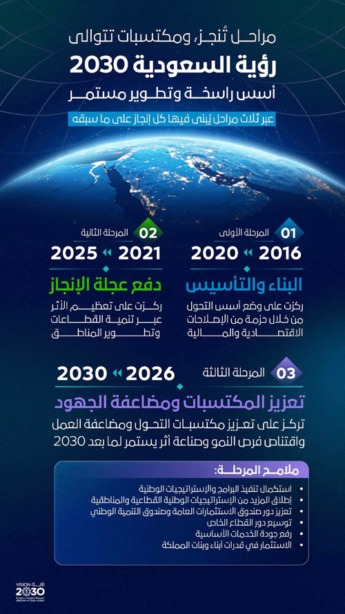 أكد صاحب السمو الملكي الأمير محمد بن سلمان بن عبدالعزيز آل سعود ولي العهد رئيس مجلس الوزراء، رئيس مجلس الشؤون الاقتصادية والتنمية -حفظه الله-، أن (رؤية المملكة 2030) قد أحدثت -بتوفيق الله وفضله- ثم بتوجيهات سيدي خادم الحرمين الشريفين الملك سلمان بن عبدالعزيز آل سعود -أيده الله- نقلة نوعية في مسيرة تنمية البلاد، بما حققته من تحول شامل وملموس في المناحي الاقتصادية، والخدمات، والبنية التحتية واللوجستية، وجوانب الحياة الاجتماعية، واستهلت في عام (2026م) مرحلتها الثالثة والأخيرة التي تمتد لخمس سنوات قادمة حتى عام (2030م)، محافظة فيها على التركيز على أهدافها طويلة المدى مع تكييف أساليب التنفيذ وفق متطلبات المرحلة، بما يدفع باستدامة التقدم والازدهار ويجعل المملكة في طليعة الدول تقدمًا.