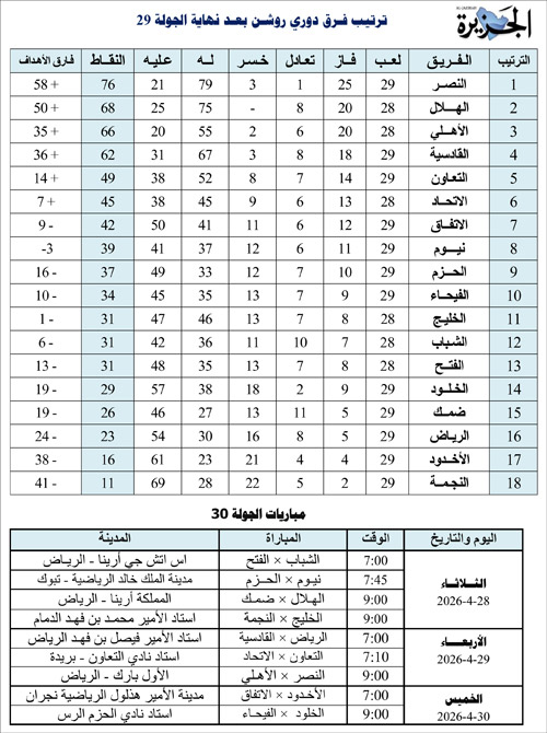 مع اقتراب مراحل الحسم بدوري روشن للمحترفين من المنتظر أن تحفل مواجهات الجولة الـ30 مساء اليوم الثلاثاء بإثارة كبيرة عندما تفتتح الجولة بـ4 مواجهات ستكون على النحو التالي: