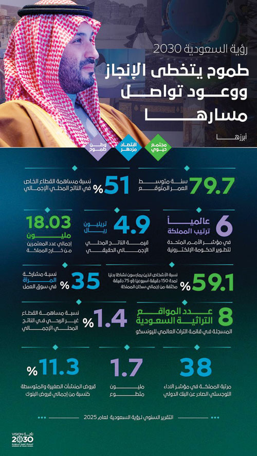 كانت الفكرة واضحة وجليّة: استثمار الإنسان.. أولًا ثم استثمار كل ما تملكه هذه الأرض من إمكانات.. ومن هنا، لم تكن الرؤية.. فقط مجرد أهداف.. بل منظومة متكاملة أعادت تعريف مفهوم التنمية في المملكة.. وبمراحل تبدأ من التخطيط إلى التمكين حيث مرت الرؤية بمراحل دقيقة ومدروسة.. ومن التأسيس والتخطيط.. إلى البناء والتنفيذ ثم إلى مرحلة التمكين والتسارع.. وفي كل مرحلة.. منها كانت هناك قرارات جريئة.. وإصلاحات نوعية.. ونقلات غير مسبوقة في قطاعات متعددة: اقتصاد.. وسياحة.. استثمار، تقنية.. جودة حياة.. وتمكين الإنسان.. ولم يكن الطريق مفروشًا بالورود، لكن الإصرار.. صنع الفارق والمنجز.. وحين تتحدث الأرقام.. بصمت الواثقين.. عمّا تحقق خلال عقدٍ واحد.. فإنه لم يكن مجرد إنجازات.. رقمية تُسرد.. بل كان تحولات تُلمس في تفاصيل الحياة اليومية.. «مدن تنبض بالحياة.. «فرص تتسع للشباب».. استثمارات تتدفق.. وإضافة إلى ذلك: حضور دولي يزداد تأثيرًا وثقة.. بل إن الأهم من ذلك.. هو تغير العقلية.. فلم يعد المواطن مجرد متلقٍ للتنمية، بل أصبح شريكًا فيها.. وصانعاً لها.
