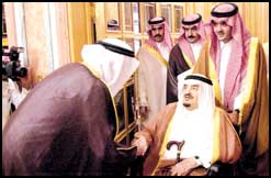 تشرف بالسلام على خادم الحرمين الشريفين الملك فهد بن عبدالعزيز آل سعود في قصر اليمامة امس صاحب السمو الملكي الأمير تركي بن ناصر بن عبدالعزيز الرئيس العام للارصاد وحماية البيئة وصاحب السمو الملكي الأمير عبدالرحمن بن ناصر بن عبدالعزيز محافظ محافظة الخرج وصاحب السمو الأمير أحمد بن عبدالله بن عبدالرحمن محافظ محافظة الدرعية بمناسبة تعيينهم في مناصبهم الجديدة.