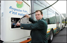 - سائق فرنسي يعبئ حافلته بالوقود الحيوي في مدينة ليل الفرنسية حيث يعمل 100 باص بالوقود المستخرج من نفايات المنازل. وتنتج محطة الوقود 4 ملايين متر مكعب في العام- (ا.ف.ب)] |