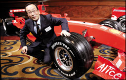 - الرئيس التنفيذي لشركة إطارات بريدجيستون يمســـك بإطار انتج خصيصاً لسيارة السباق فيراري. وبريدجيستون هـــي الوكيل الوحيد للإطاــــرات في بطولـــة الفــورمـلا 1 - (رويترز)] |